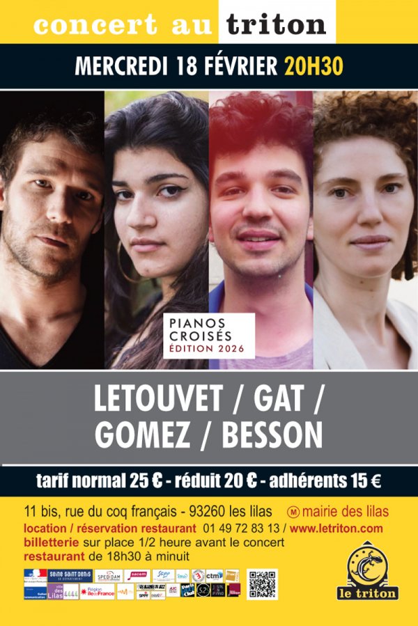 Quatre pianistes, quatre univers qui se répondent : les explorations sonores d’Estreilla Besson, les labyrinthes polyrythmiques de Grégoire Letouvet, les découpages électroacoustiques de Thibault Gomez et le lyrisme volubile de Nina Gat s’entrelacent pour créer une matière sonore commune, jubilatoire et organique !